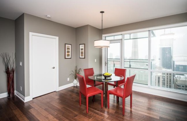 The Festival Tower is a 2 bedroom, 2 bathroom 1120 square foot corner furnished suite and is the perfect fit for anyone looking for spacious luxury while on extended stay in Toronto. The fully furnished condo features include floor to ceiling windows, hardwood flooring, solid entry doors installed with chrome hardware, contemporary finishes and casings that give a this unit a modern yet conformable feel.
